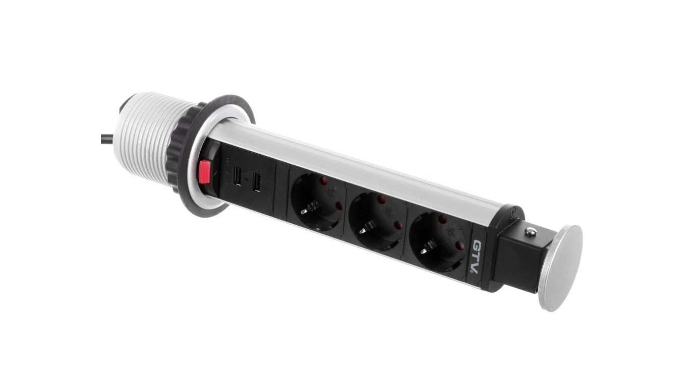 Biurkowy przedłużacz wpuszczany 60mm, 3x schuko, 2xUSB 2,1A 5V (srebrny)