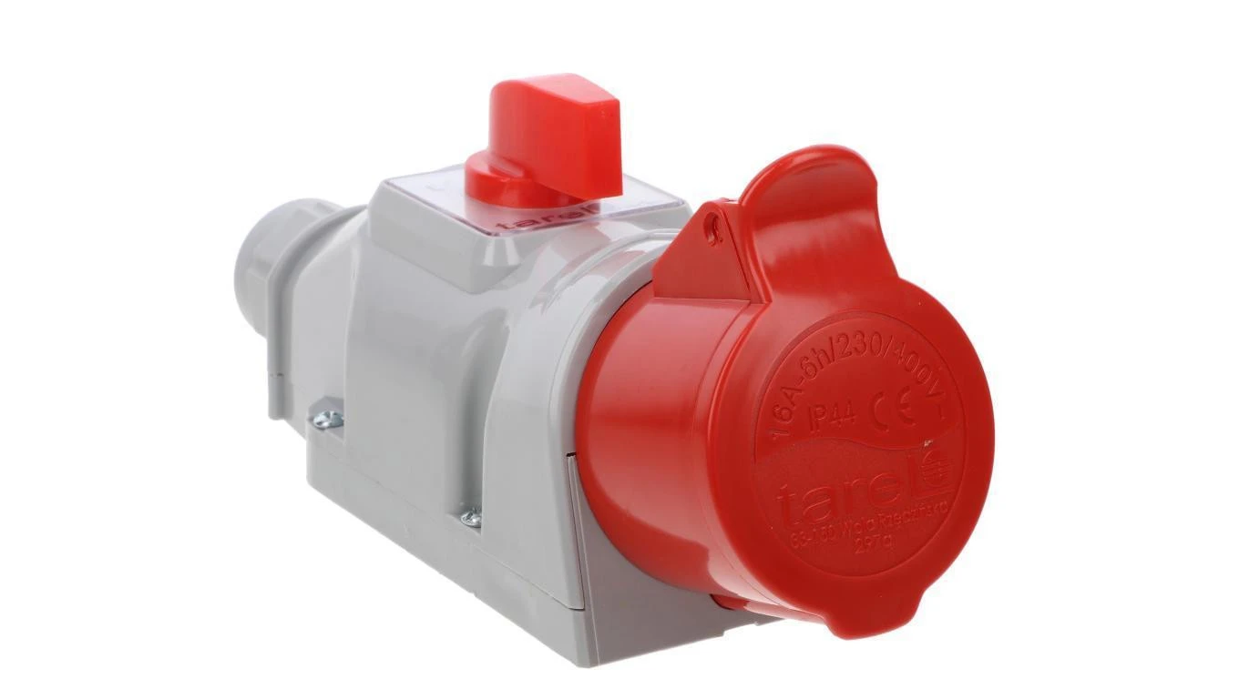 Gniazdo stałe 7P 16A 400V czerwone IP44 6H z wyłącznikiem i podwójną blokadą mechaniczną 16378