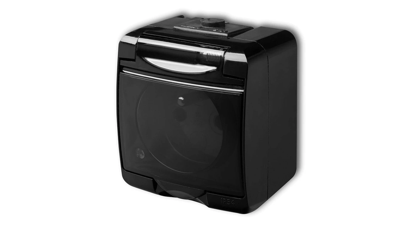Gniazdo hermetyczne pojedyncze z uziemieniem Karlik Junior 12GHE-1D (klapka dymna) 2P+Z bez przesłon czarne