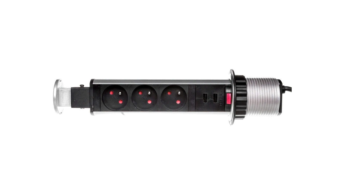 Gniazdo meblowe fi6cm, 3x250V AC wysuwane z blatu z ładowarką USB, blokadą i przewodem 1,8m srebrne OR-AE-1349