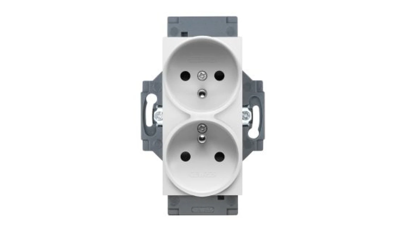 Gniazdo z uziemieniem 2P+E 16A, podwójne, z przesłonami styków, zaciski śrubowe, biały, Dahlia GW35214W