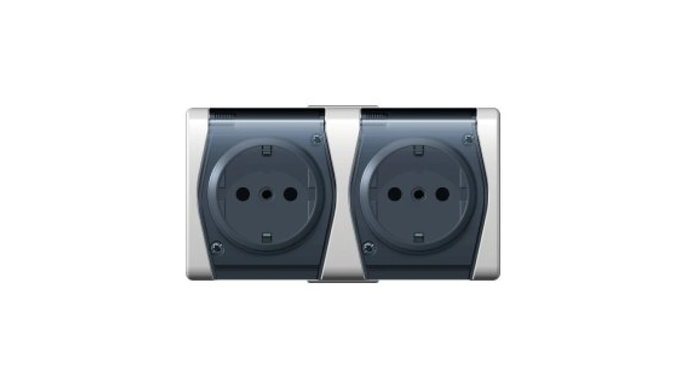 Hermes2 Gniazdo hermetyczne podwójne z/u 16A SCHUKO IP44 z klapką biało-dymne 1025-01