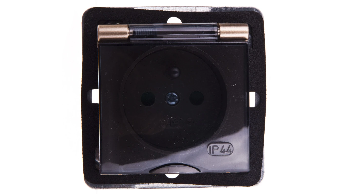 IMPRESJA Gniazdo bryzgoszczelne z/u IP44 z przesłonami klapka przezroczysta złoty metalik GPH-1YZP/m/28/d