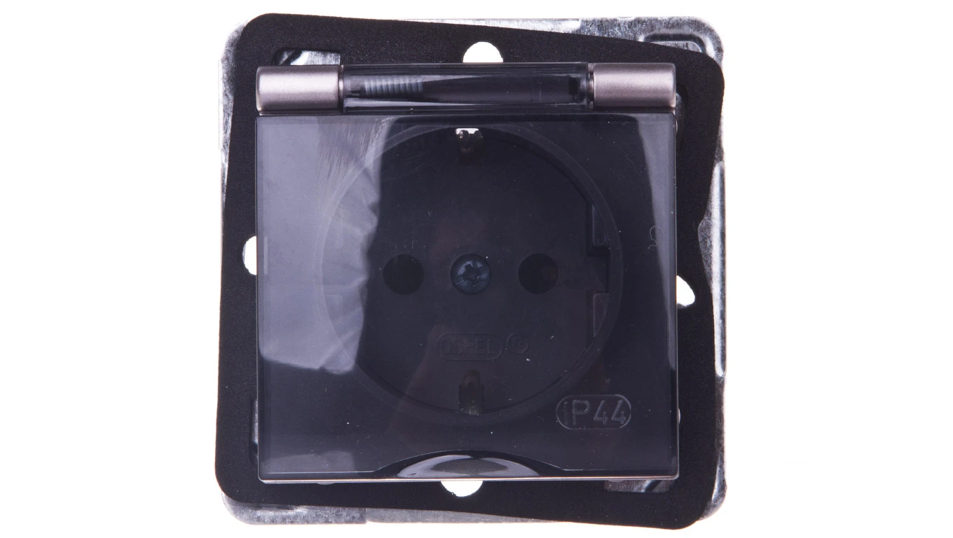 IMPRESJA Gniazdo bryzgoszczelne z/u Schuko IP44 klapka przezroczysta tytan GPH-1YS/m/23/d