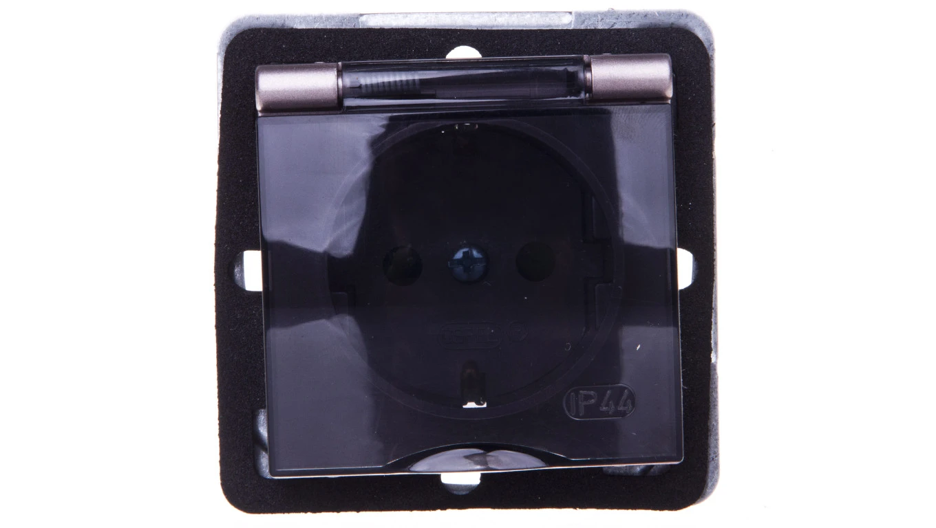 IMPRESJA Gniazdo bryzgoszczelne z/u Schuko IP44 z przesłonami klapka przezroczysta tytan GPH-1YSP/m/23/d