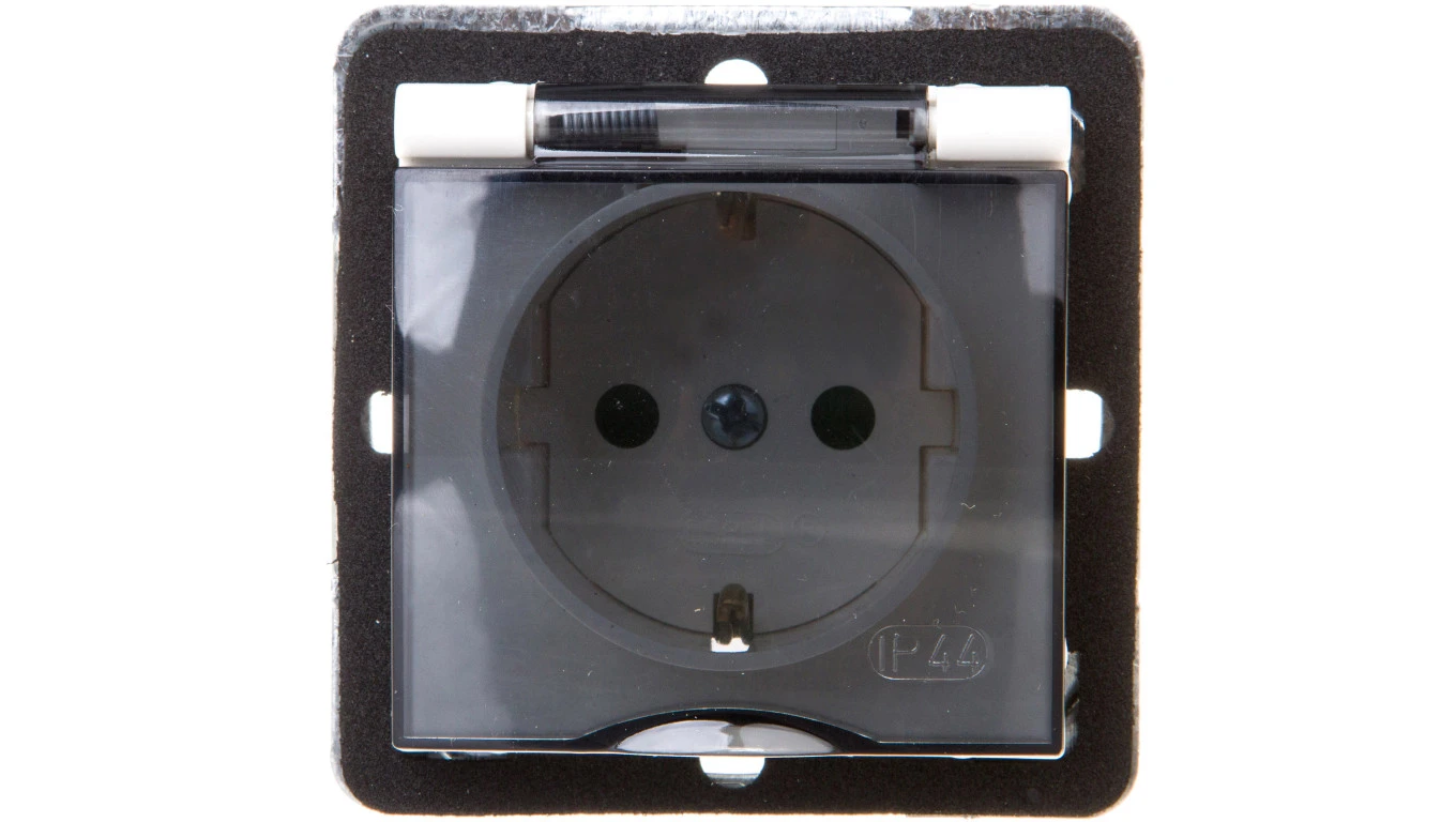 IMPRESJA Gniazdo bryzgoszczelne z/u Schuko IP44 z przesłonami klapka przezroczyste ecrue GPH-1YSP/m/27/d