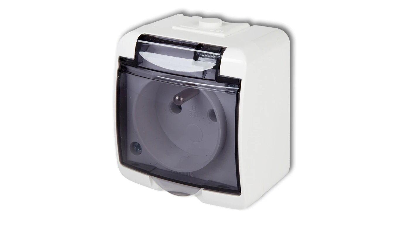 JUNIOR Gniazdo pojedyncze z/u (klapka dymna) biały IP54 GHE-1d