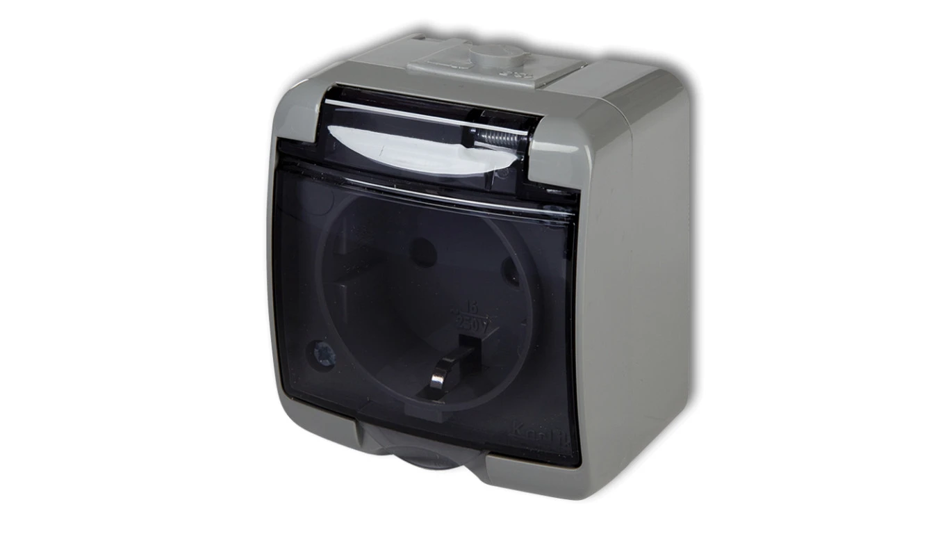JUNIOR Gniazdo pojedyncze z/u SCHUKO (klapka dymna) popielaty 10GHE-1sd