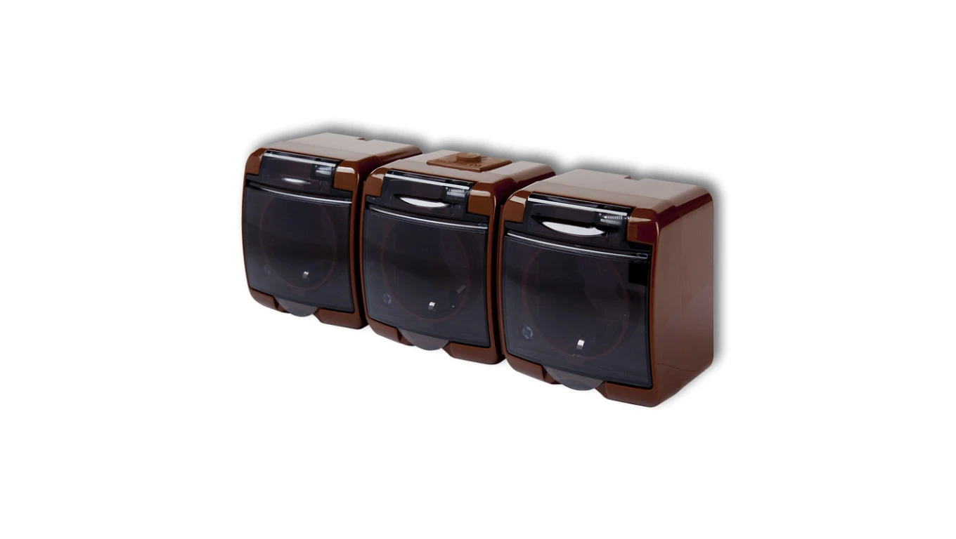 JUNIOR Gniazdo potrójne 3x(z/u) SCHUKO (klapka dymna) brązowy 4GHE-3sdp