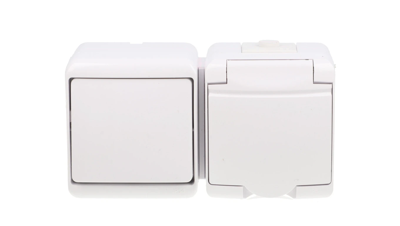 JUNIOR Łącznik jednobiegunowy + gniazdo hermetyczne (klapka biała) biały IP54 WGHH-1