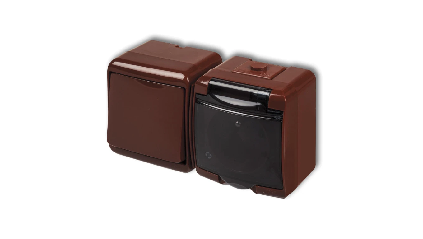 JUNIOR Łącznik jednobiegunowy + gniazdo hermetyczne (klapka dymna) brązowy 4WGHH-1dp