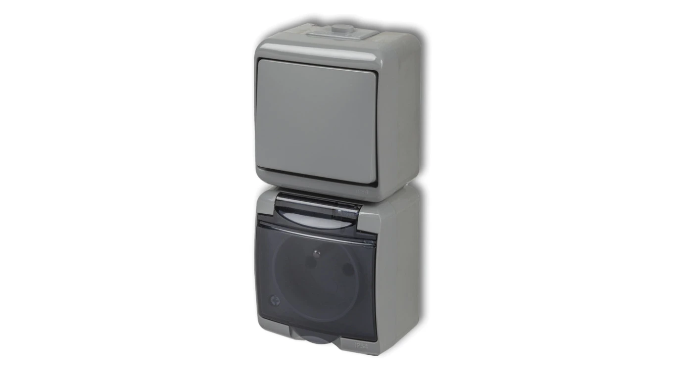 JUNIOR Łącznik jednobiegunowy + gniazdo hermetyczne (klapka dymna) popielaty 10WGHP-1d