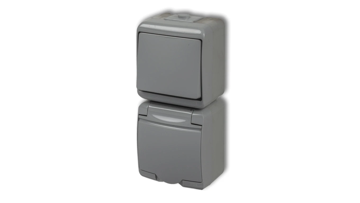 JUNIOR Łącznik jednobiegunowy + gniazdo hermetyczne (klapka popielata) popielaty 10WGHP-1
