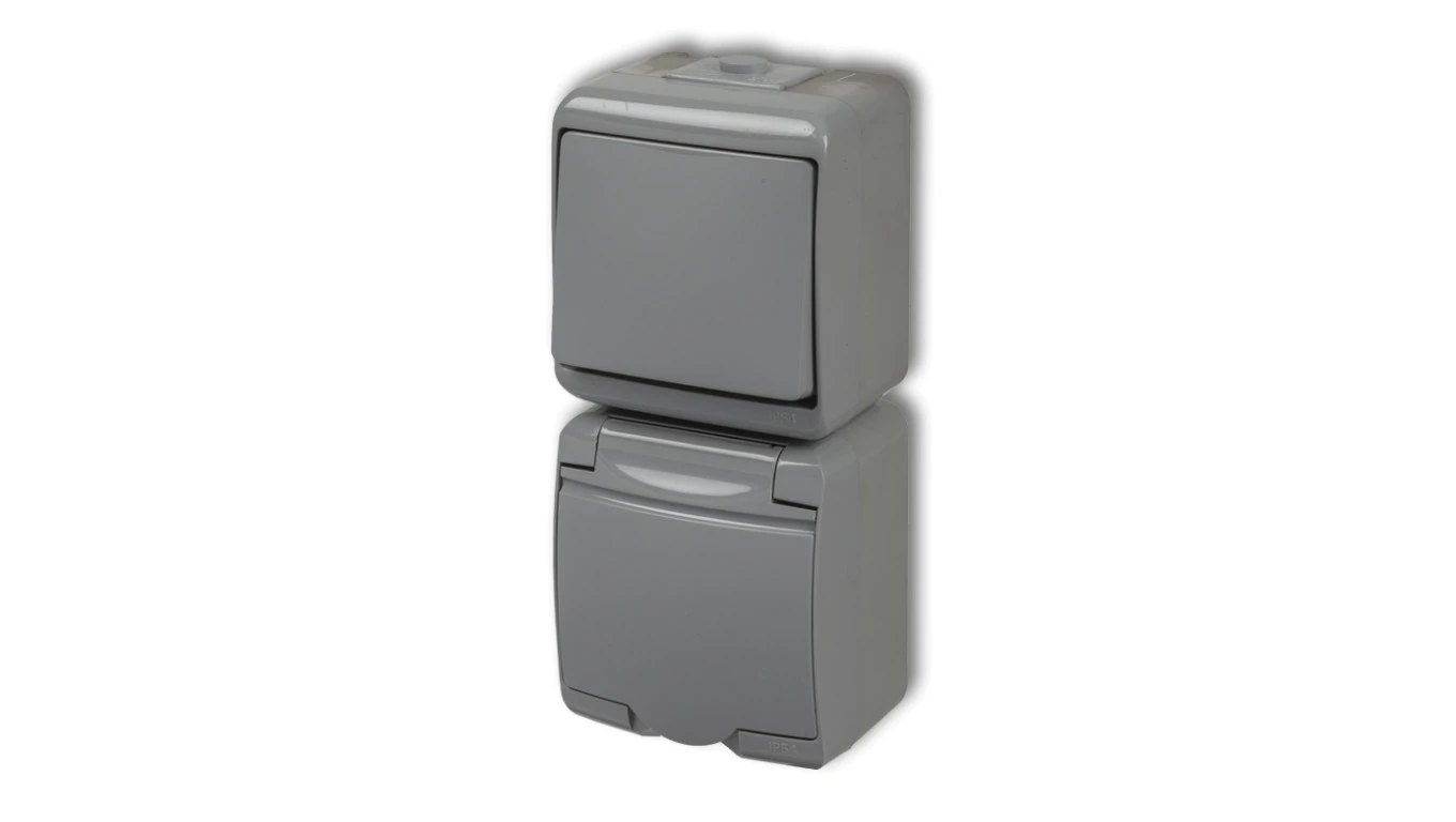 JUNIOR Łącznik jednobiegunowy + gniazdo hermetyczne (klapka popielata) popielaty 10WGHP-1p