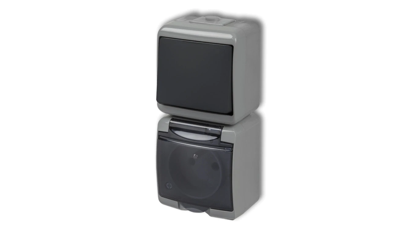 JUNIOR Łącznik jednobiegunowy z gniazdem hermetycznym (klapka dymna) popielaty / grafitowy 30WGHP-1d