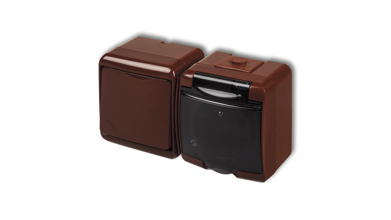 JUNIOR Łącznik schodowy + gniazdo hermetyczne (klapka dymna) brązowy 4WGHH-3d