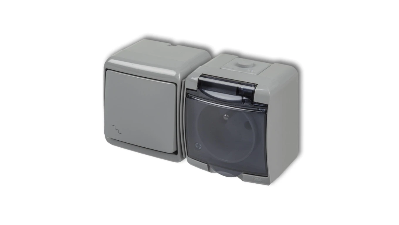 JUNIOR Łącznik schodowy + gniazdo hermetyczne (klapka dymna) popielaty 10WGHH-3d