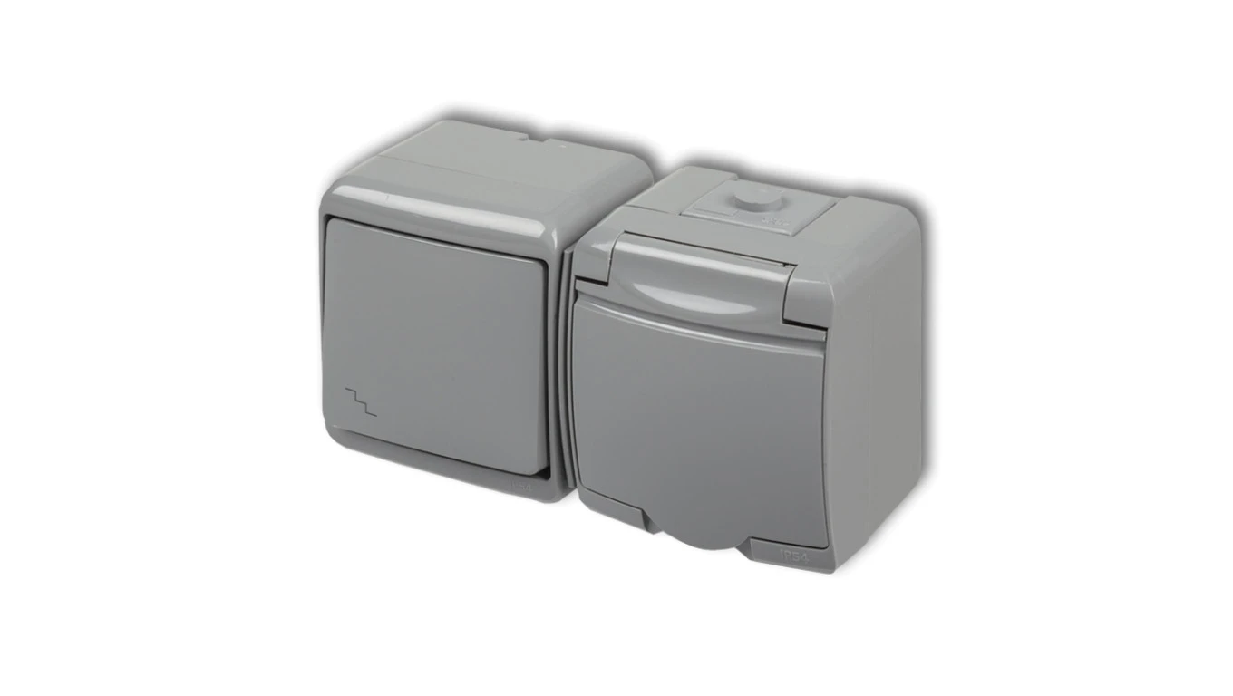 JUNIOR Łącznik schodowy + gniazdo hermetyczne (klapka popielata) popielaty 10WGHH-3