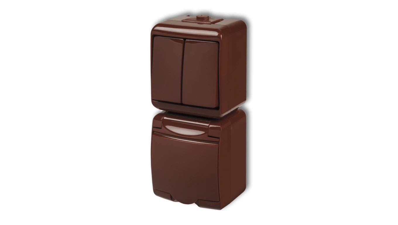 JUNIOR Łącznik świecznikowy + gniazdo hermetyczne (klapka brązowa) brązowy 4WGHP-2p