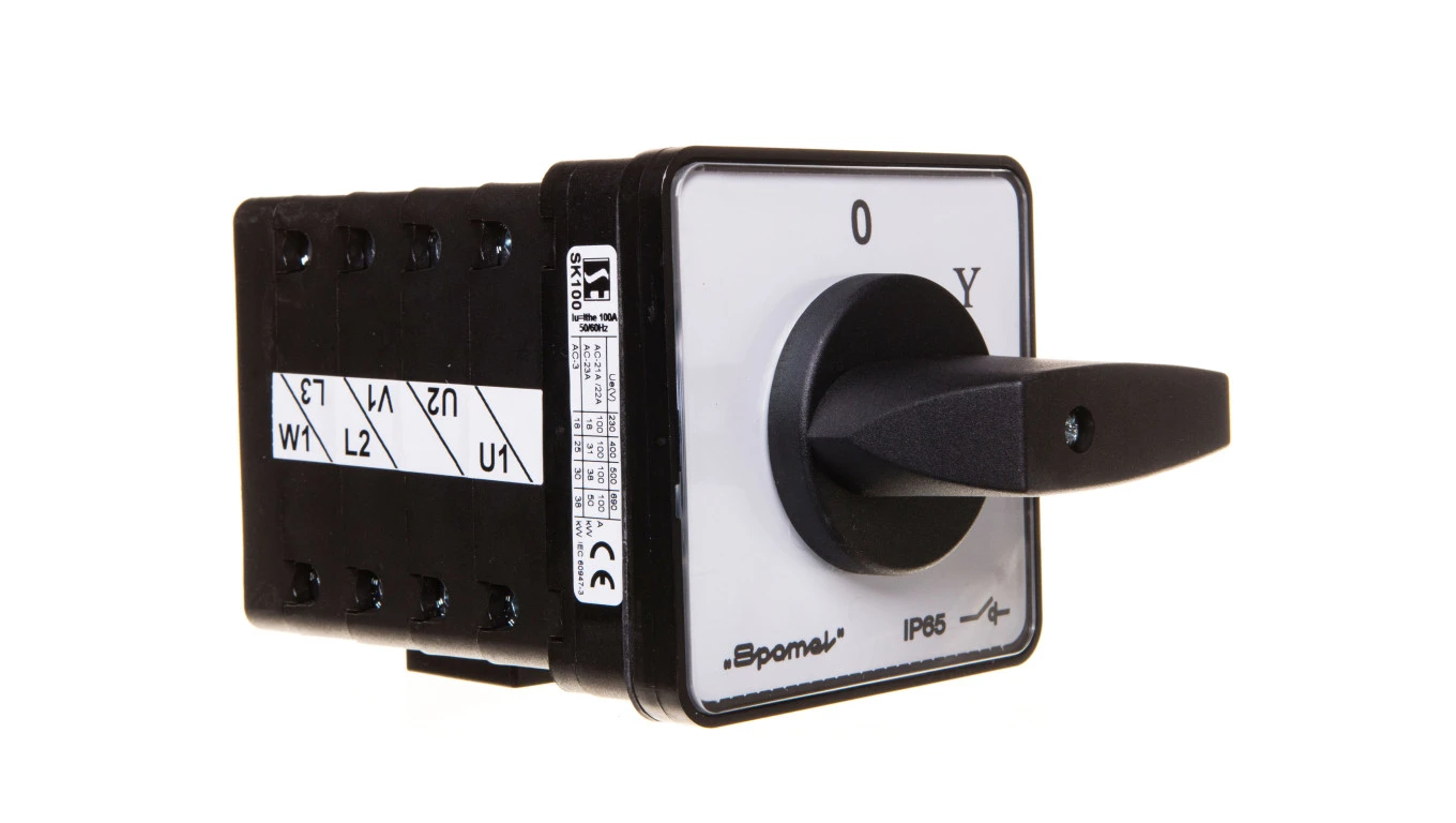 Łącznik krzywkowy 0-gwiazda-trójkąt 100A mocowany do pulpitu pokrętło czarne SK100-4.831P03