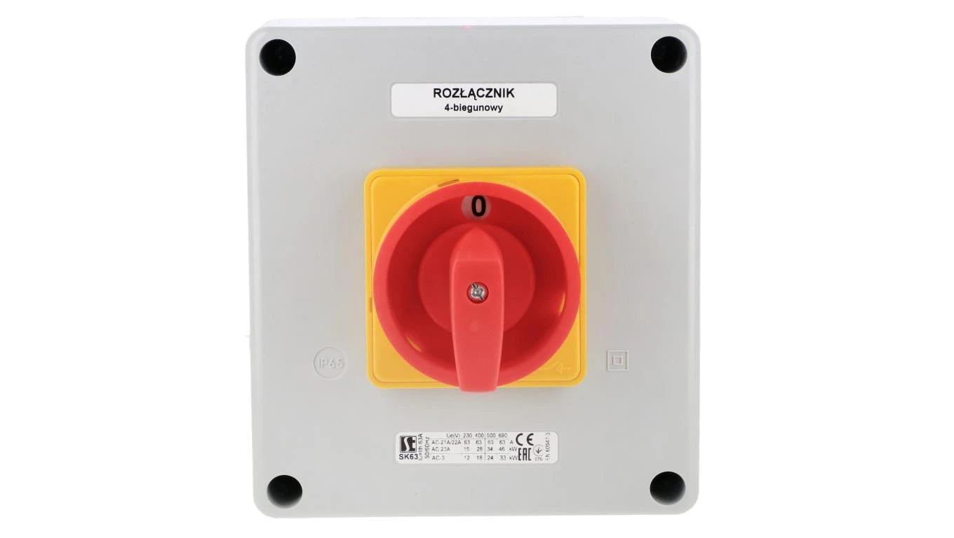 Łącznik krzywkowy 63A rozłącznik 0-1 (4 - biegunowy)w obudowie OB16 z czołem zamykanym żółto/czerwonym SK63-2.8210\OB16ZC