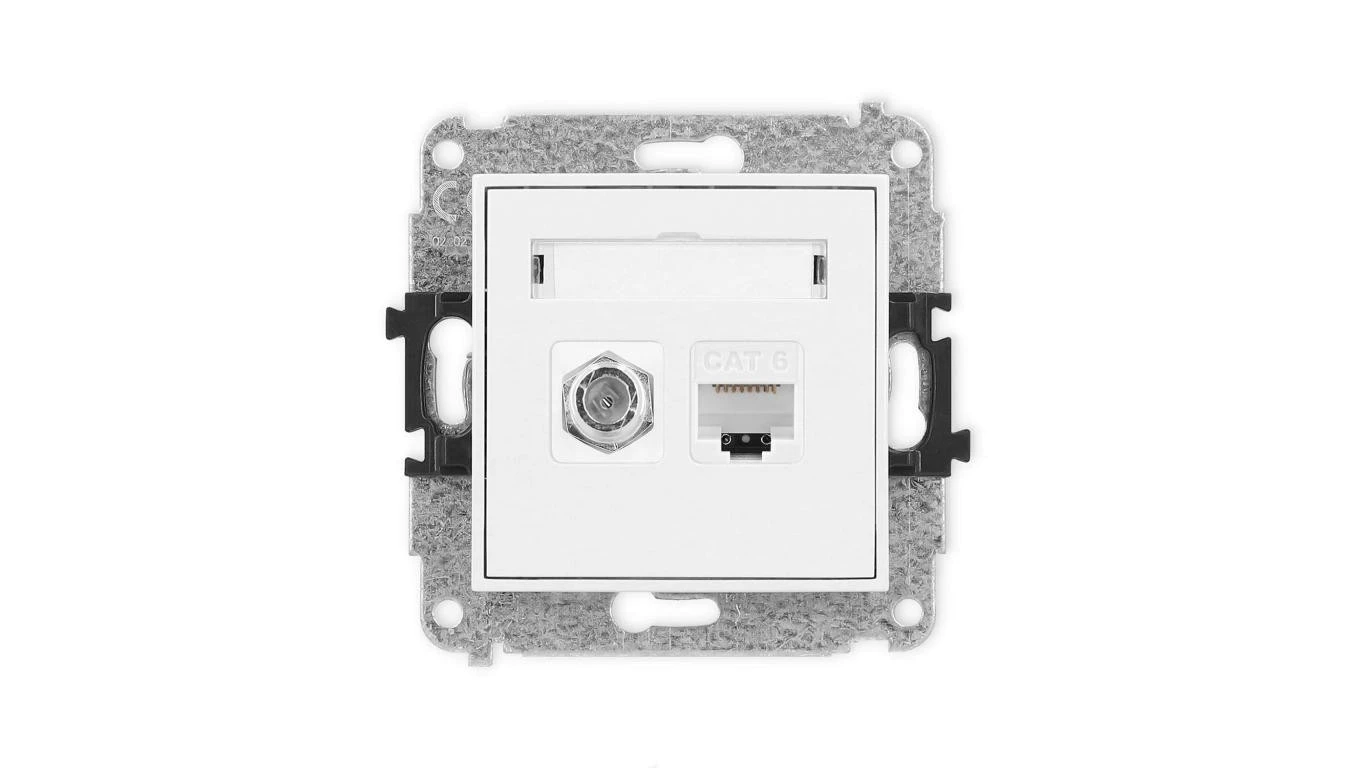 MINI Mechanizm gniazda antenowego poj. typu F (SAT) + gniazda komp. poj. 1xRJ45, kat. 6, 8-stykowy biały mat 25MGFK-3