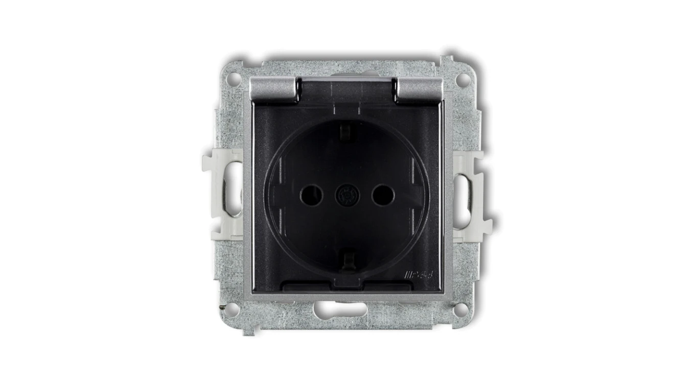 MINI Mechanizm gniazda bryzgoszczelnego z uziemieniem SCHUKO 2P+Z (klapka dymna, przesłony torów prądowych) srebrny metalik 7MGP