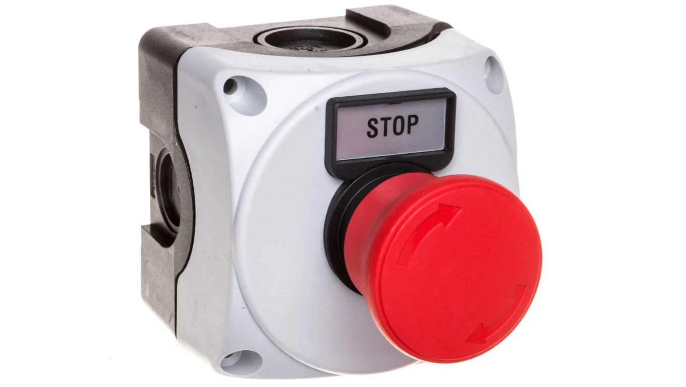 Obudowa szara LPZP1A8 z przyciskiem grzybkowym LPCB6344, odblokowanie przez obrót, etykietą STOP, zestyk 1NZ IP67 LPZP1B802