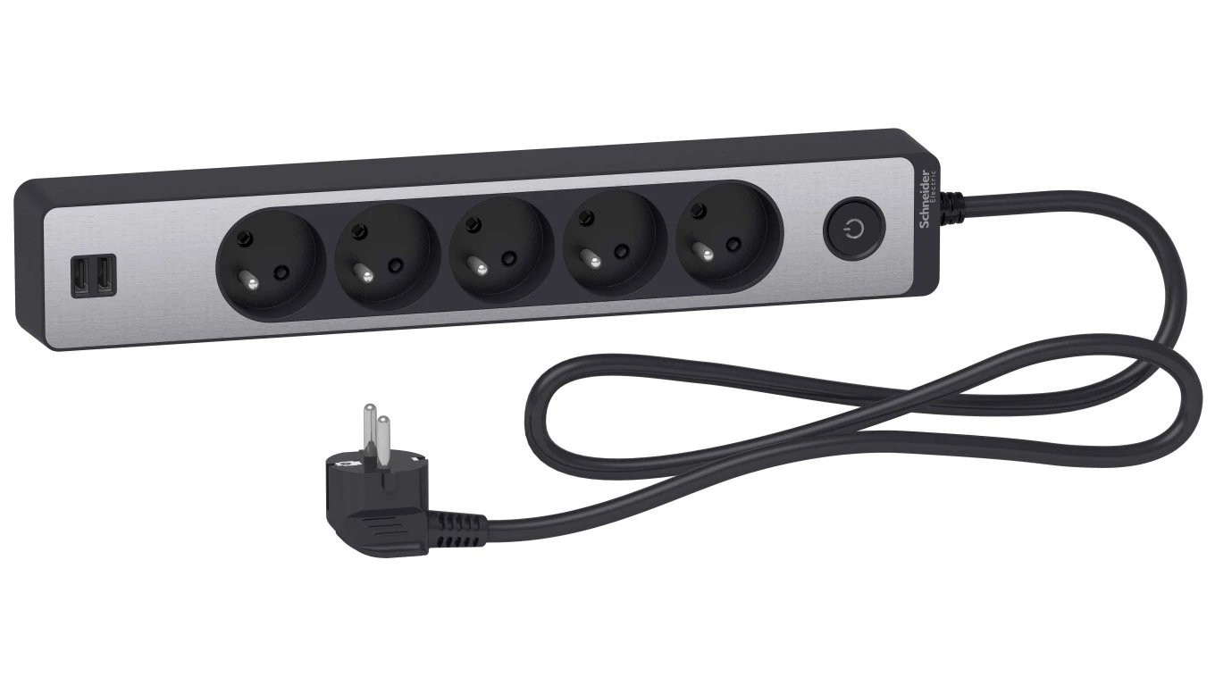 Odace Przedłużacz 5 gniazdowy z łącznikiem 2x USB, 1,5m antracyt+szczotkowane aluminium ST935U1BA