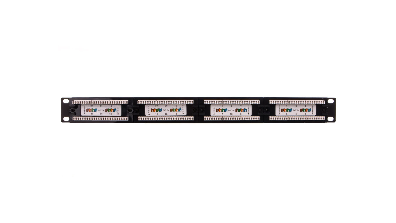 Patch panel kompletny 19 cali 24x RJ45 U/UTP kat. 5e 1U czarny RAL 9005 DN-91524U-1