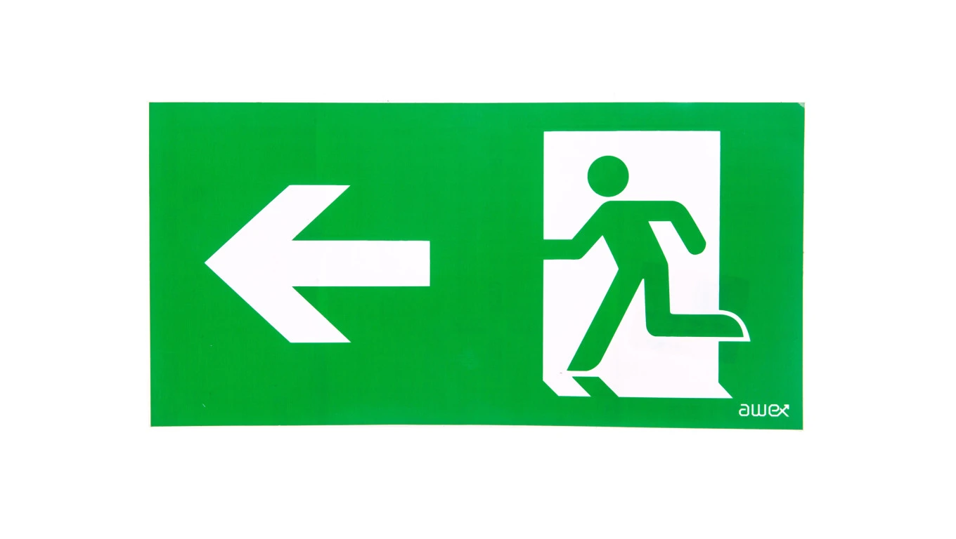 Piktogram PD24 140x300 strzałka w lewo człowiek w drzwiach logo awex (ISO7010)