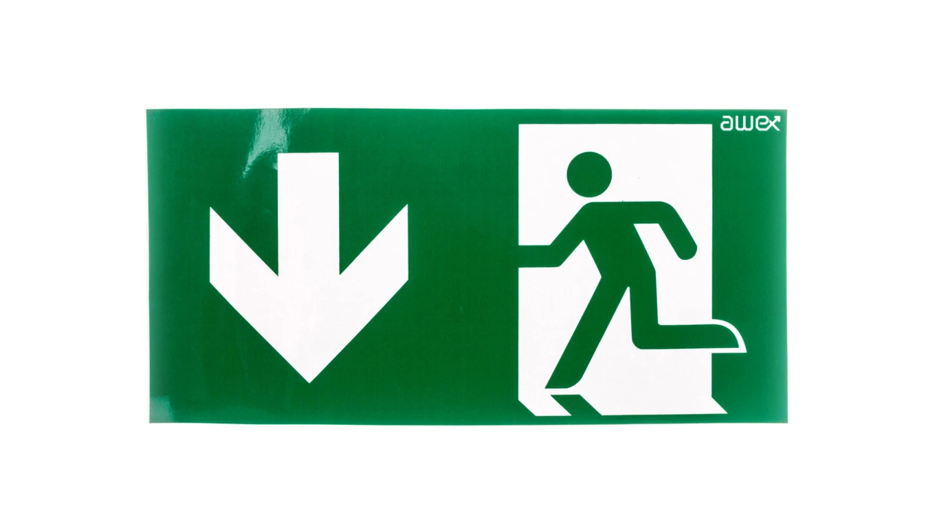 Piktogram PD26 150x300 strzałka w dół z lewej strony, człowiek w drzwiach (ISO7010)