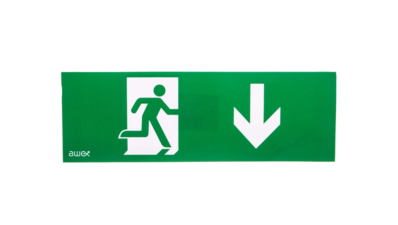 Piktogram PM27 100x300 człowiek w drzwiach strzałka dół logo awex (ISO7010)
