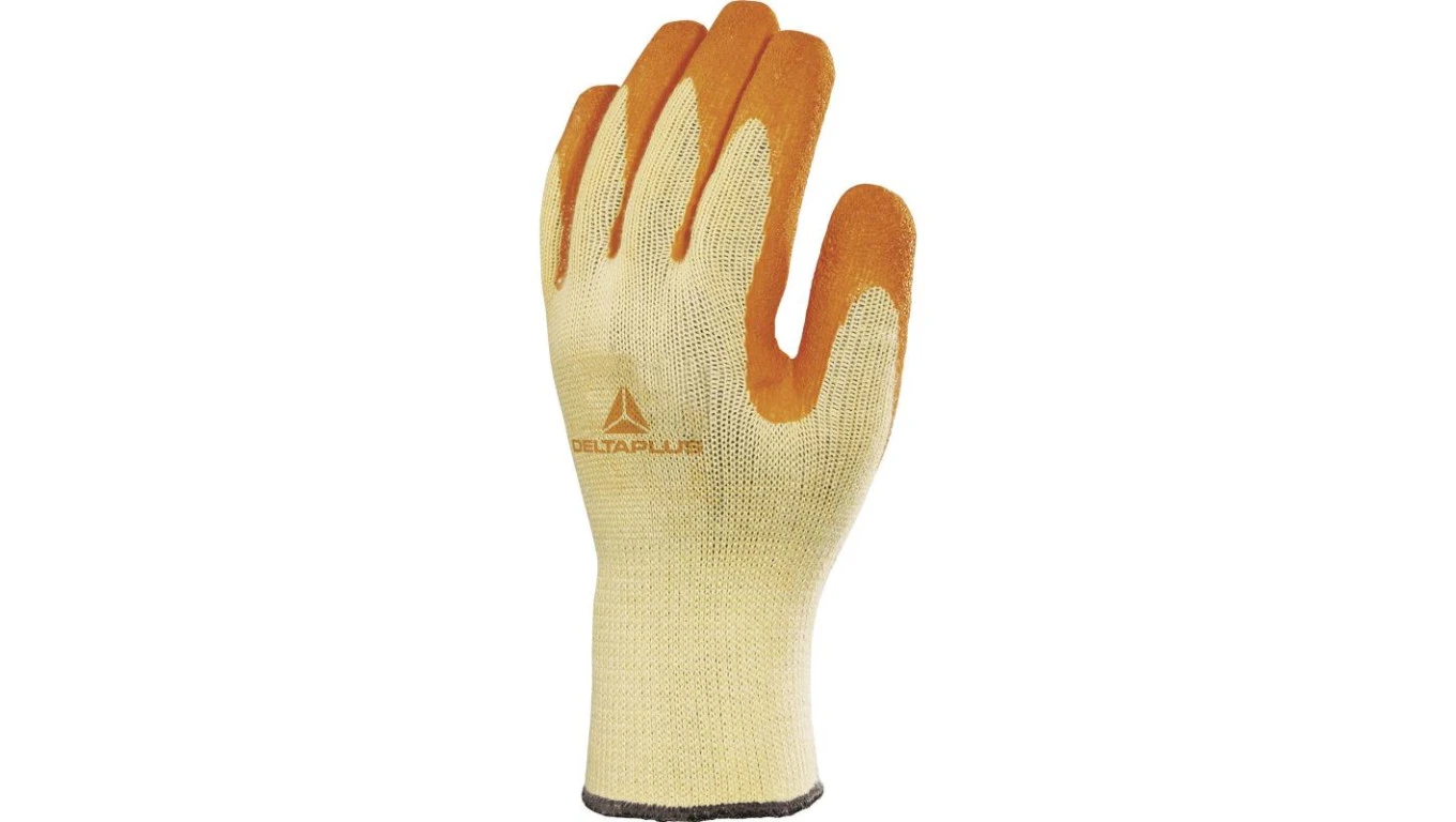 Rękawice dziane z poliestru i bawełny, dłoń i końce palców powlekane Lateksem, ścieg 10 żółto-pomarańczowe rozmiar 9 VE730OR09