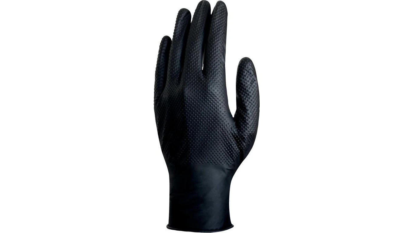 RĘKAWICE JEDNORAZOWE Z NITRYLU, NIEPUDROWANE, NITRYL O CHROPOWATEJ TEKSTURZE, OPAKOWANIE 50, CZARNE, ROZMIAR 10/11, V1600B5010