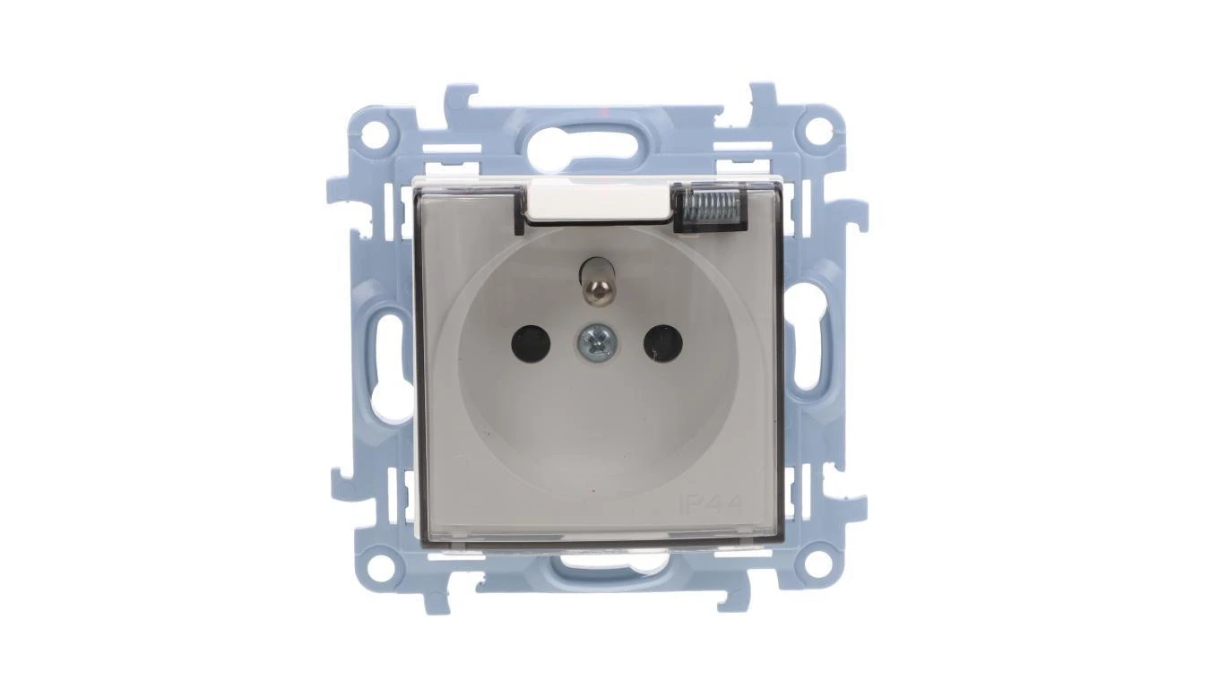 Simon 10 Gniazdo pojedyncze IP44 z uszczelką z przesłonami torów prąd. klapka w kolorze transparentnym, szybkozłącza, biały 16A.