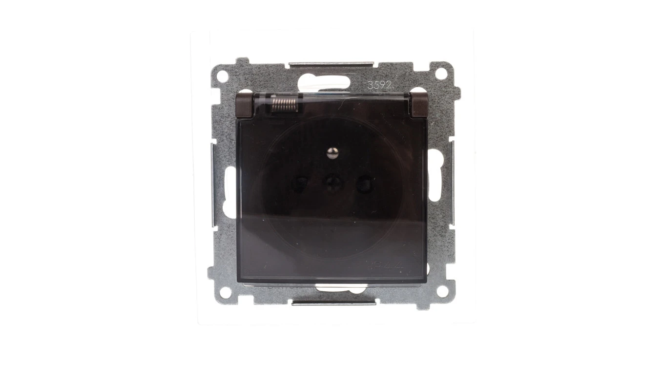 Simon 54 Gniazdo bryzgoszczelne z/u IP44 z przesłoną torów z klapką brąz mat DGZ1BZ.01/46A