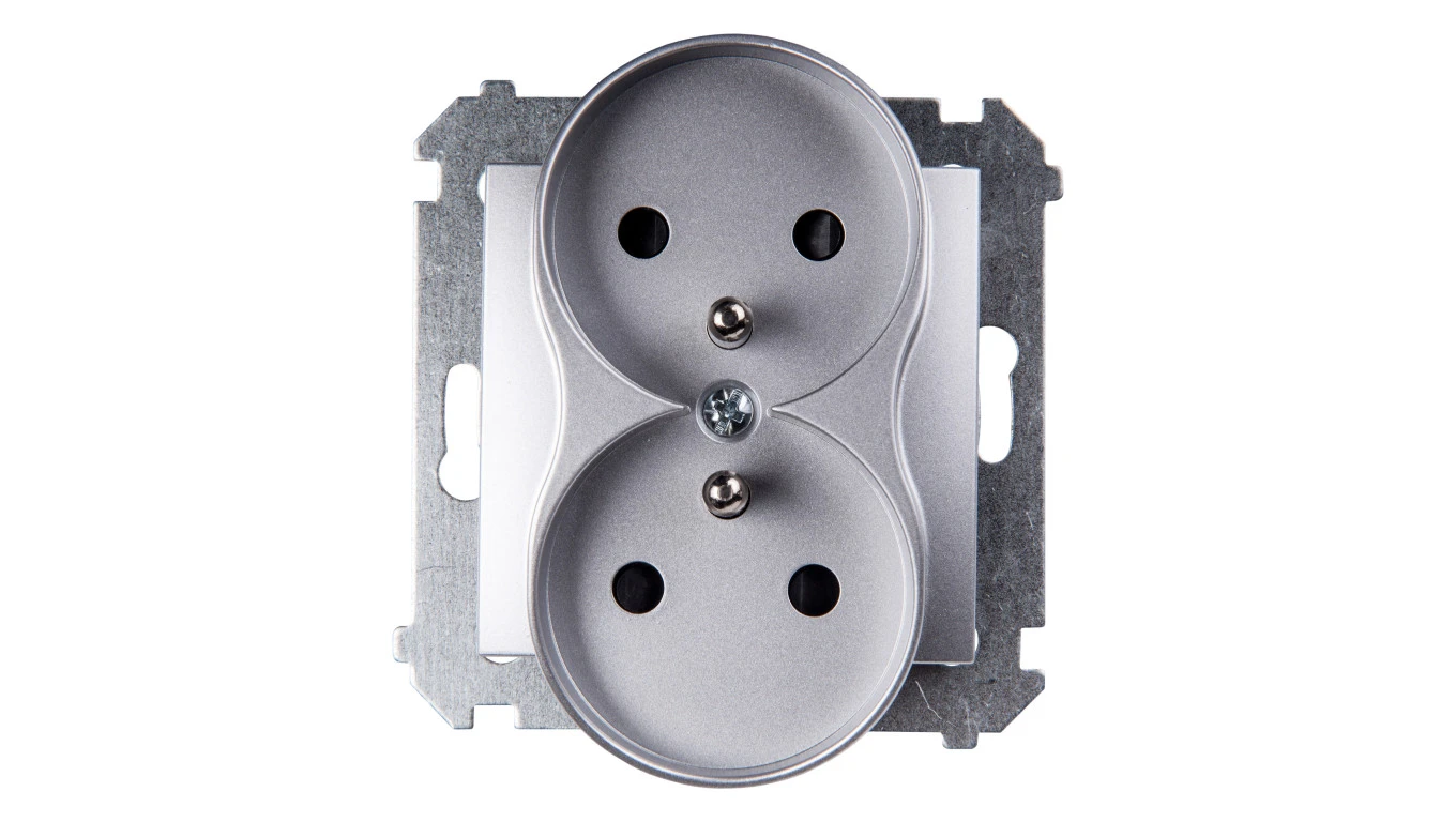 Simon 54 Gniazdo podwójne z/u 16A IP20 z przesłoną torów srebrny mat DGZ2MZ.01/43
