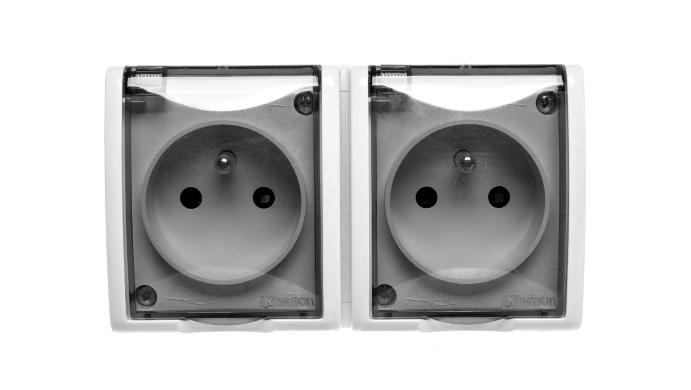 Simon Aquarius Gniazdo hermetyczne podwójne z/u IP54 z i przesłoną torów i klapką transparentną białe AQGZ1-2z/11a