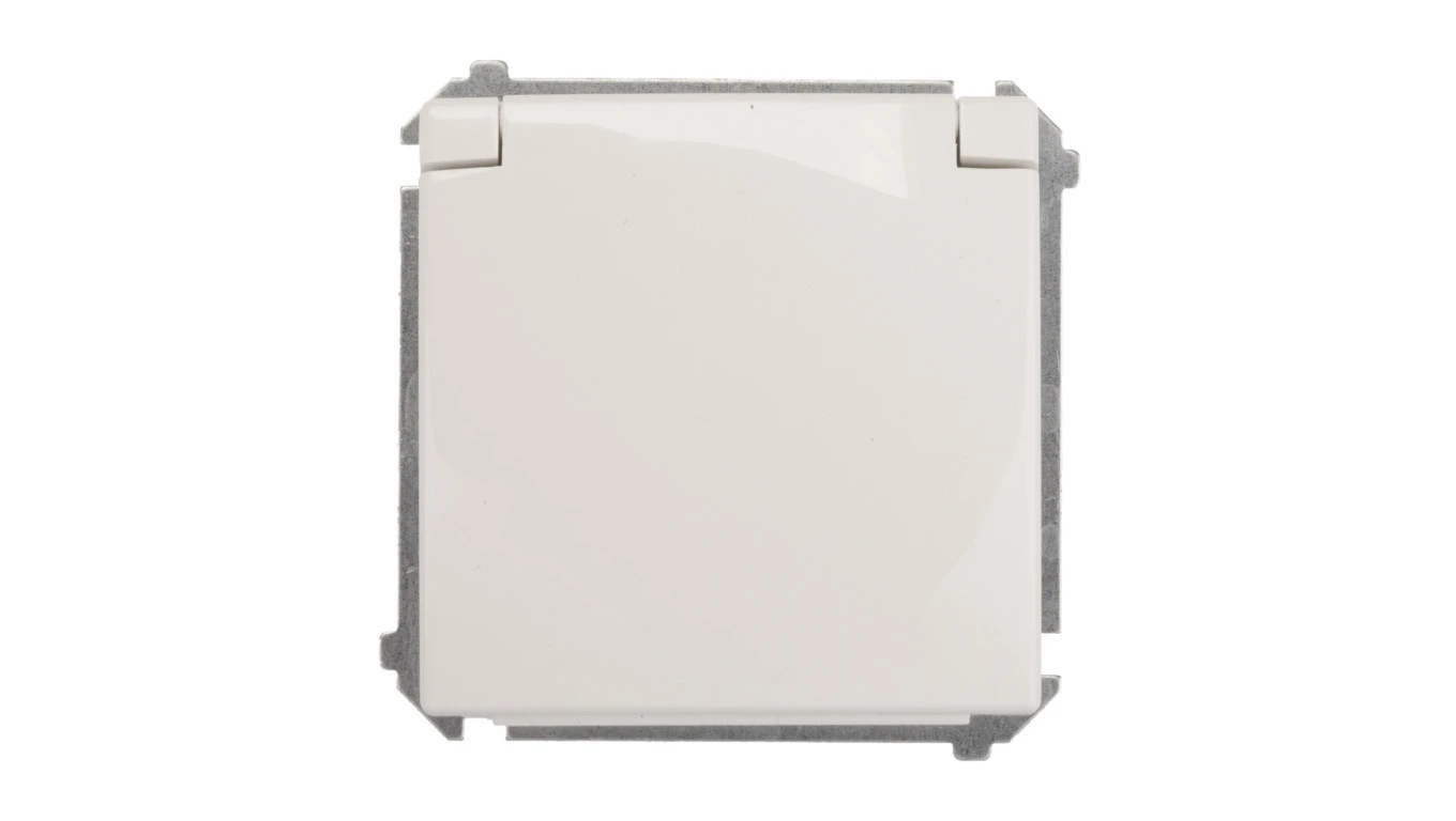 Simon Basic Gniazdo bryzgoszczelne z/u IP44 z przesłoną torów i klapką białe BMGZ1Bz.01/11
