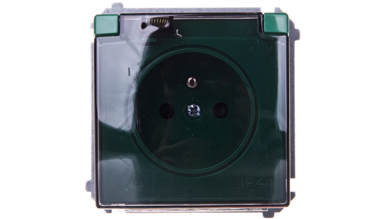 Simon Basic Gniazdo bryzgoszczelne z/u IP44 z przesłoną torów i klapką dymną zielone BMGZ1Bz.01/33a