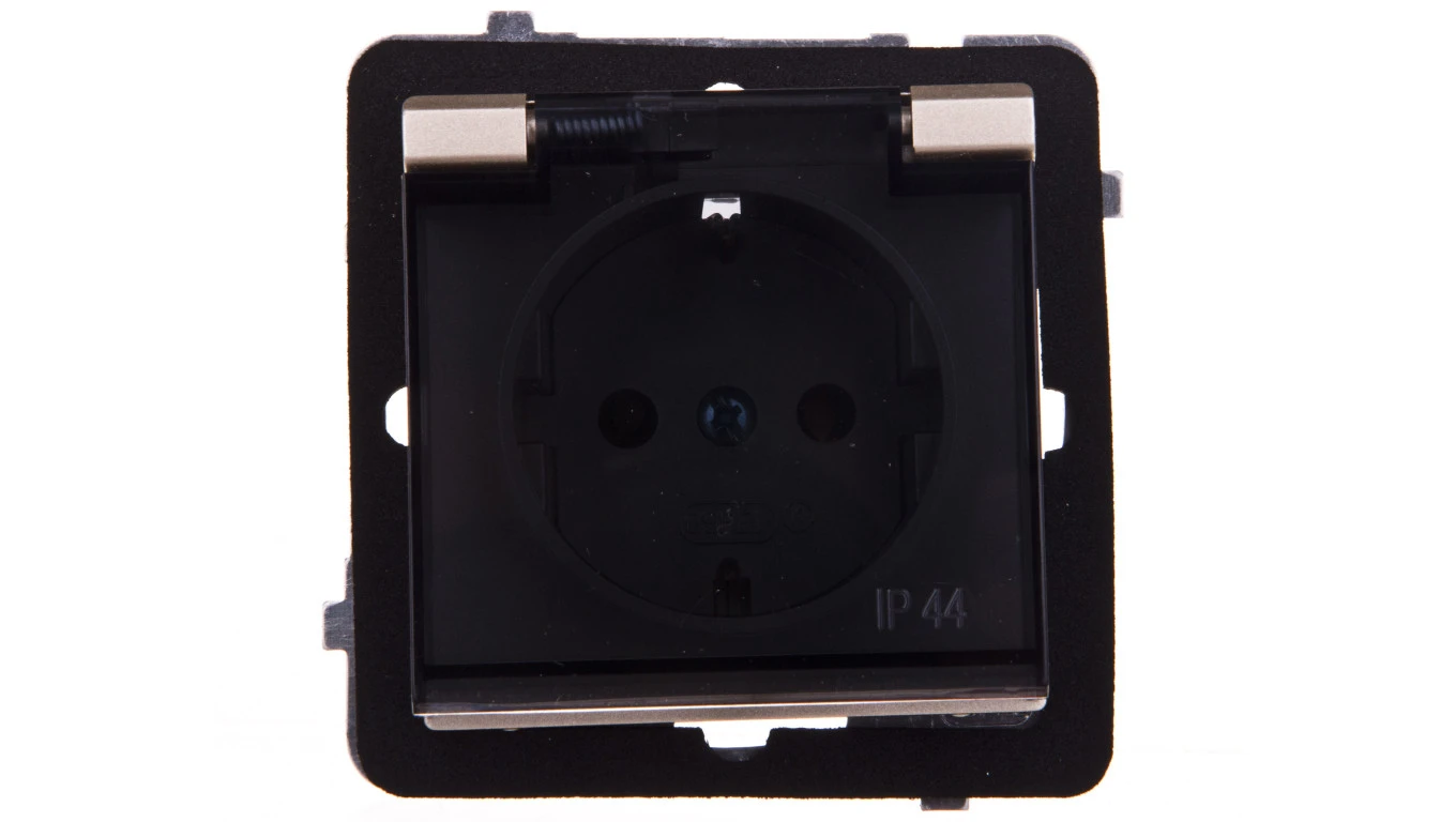 SONATA Gniazdo bryzgoszczelne z/u Schuko IP44 klapka przezroczysta szampański złoty GPH-1RS/m/39/d