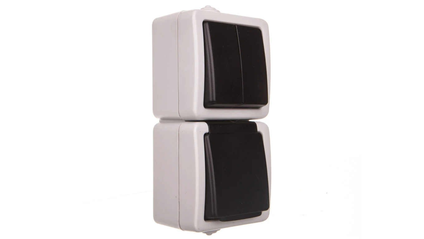 TEKNO Łącznik świecznikowy + Gniazdo pionowe z przesłoną styków śrubowe 10AX/16A 250V szare IP54 25362