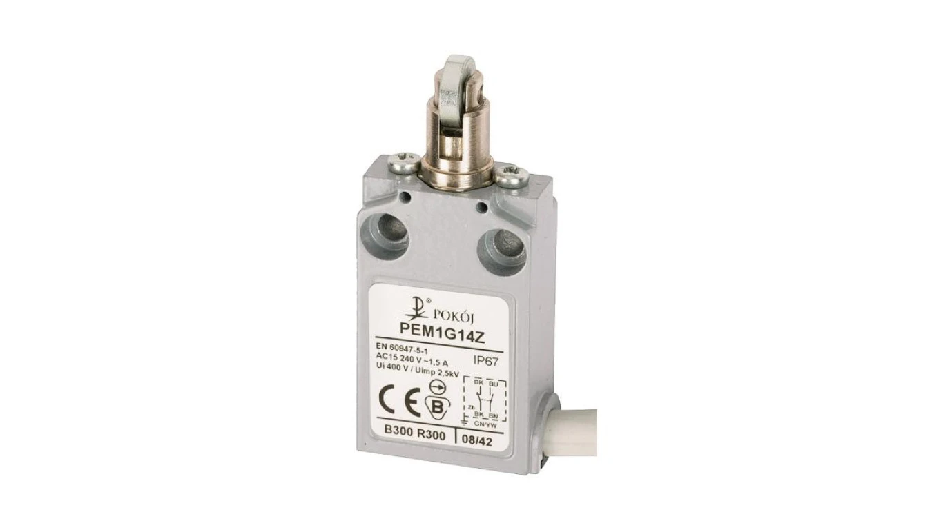 Wyłącznik krańcowy 1R 1Z wolnoprzełączający popychacz metalowy z rolką stalową prostopadłą Ø12 PEM1G14X A37-A85X