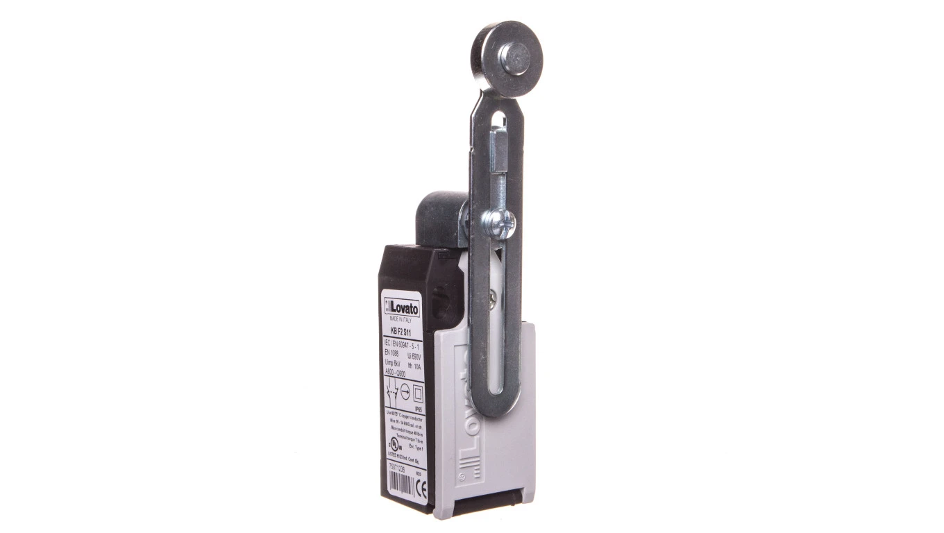 Wyłącznik krańcowy z dźwignią regulowaną z rolką, rolka metalowa, obudowa z tworzywa, 1R 1Z zestyki migowe KBF2S11