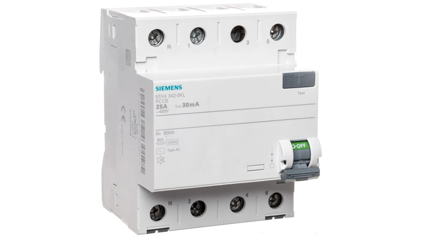 Wyłącznik różnicowoprądowy 4P 25A 0,03A typ AC biegun N z lewej 30mA 400V SENTRON 5SV4342-0KL